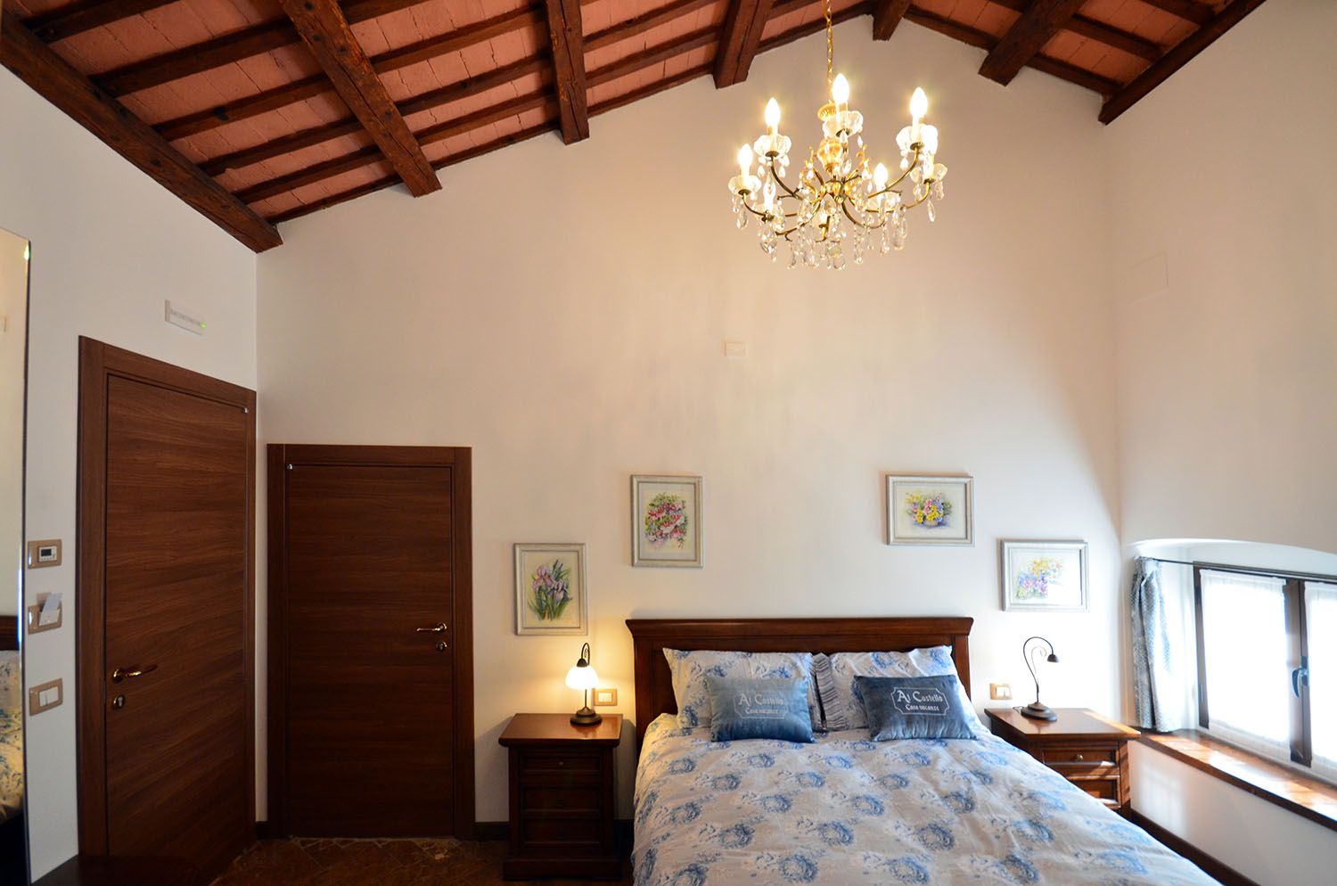 Graceful, neutral and relaxing colours with floral paintings on the walls to convey the elegant and harmonious style of the past. The terracotta tiled floor is old and well-used, and the ceiling has a double slope with wooden beams and exposed tiles. The bathroom, in total harmony with the elegant furnishings, is equipped with all the fittings and a shower cubicle.